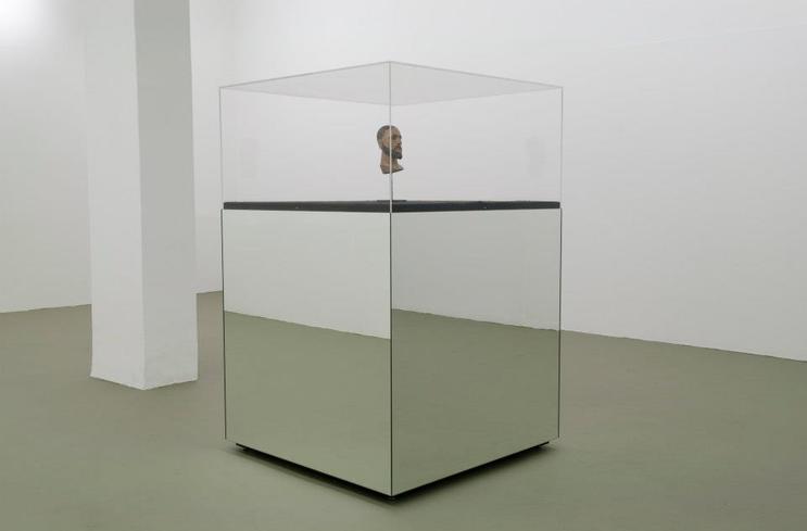 "Imagem", cabeça de imagem de roca processional do séc. XVIII, pele inteiriça animal, espelho prata lapidado com corte em 45° e acrílico, 180 x 120 x 120 cm. Fotos: Edouard Fraipont